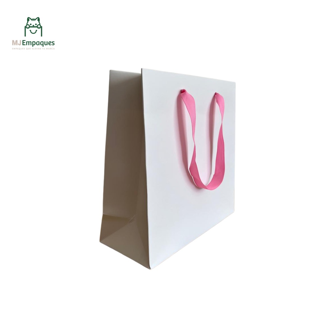 Bolsa lujo blanca 25x25x10 asa rosada